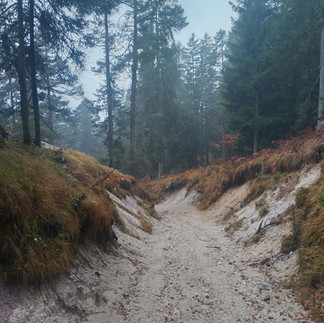Ich frühstückte um 7:30 Uhr und machte mich um 8:15 Uhr auf den Weg. Der gesamte Aufstieg bis zur Grenze führte auf gut ausgebauten Forst- und Almenwegen. Es war den ganzen Tag neblig, und ein Schild, das vor Bären warnte, ließ mich bei dieser schummrigen Stimmung auf meine geliebten Podcasts verzichten.