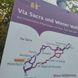 Der Weg führt in leichtem Auf und Ab durch den Wienerwald und ist angenehm zu gehen. Es regnete leicht, und in Heiligenkreuz beschlossen wir, für heute Schluss zu machen, da bald ein Bus fahren würde. Es schien nicht sinnvoll, noch vier Kilometer weiter bis Mayerling zu gehen und dann möglicherweise lange auf einen Bus warten zu müssen.
